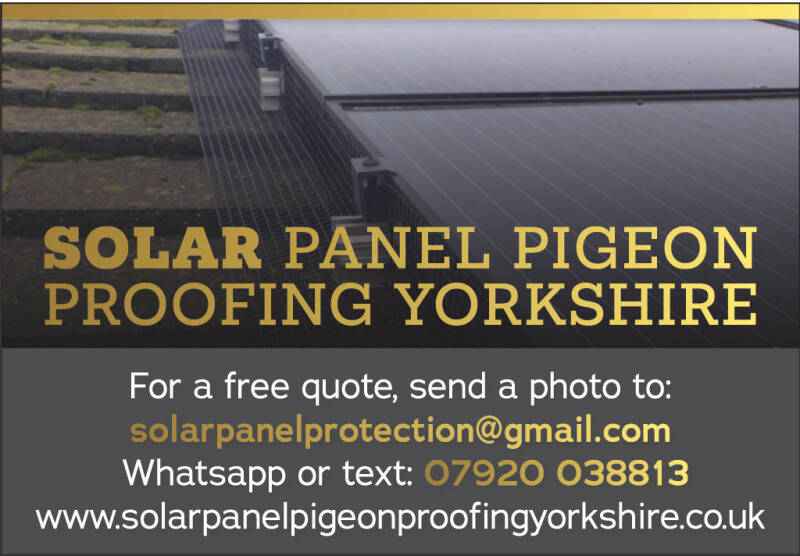 I Supply and Install quality black PVC coated galvanised welded wire mesh and specially designed stainless steel hook style fixing clips, so no drilling into the solar panels. This system will stop any pigeons going under your solar panels, I am based in York but will cover all of Yorkshire.